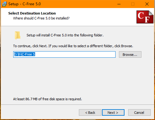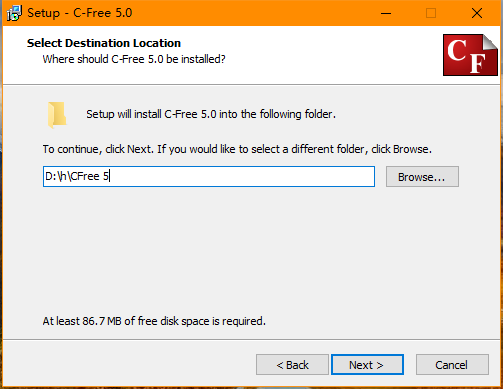 在此处, 我们需要 修改安装路径 名, 安装路径中只能有 数字, 英文字母与空格, 不能用中文或者符号, 否则有些系统会找不到编译器. 所以我们修改默认的文件夹名 C-Free 5 为 CFree5
