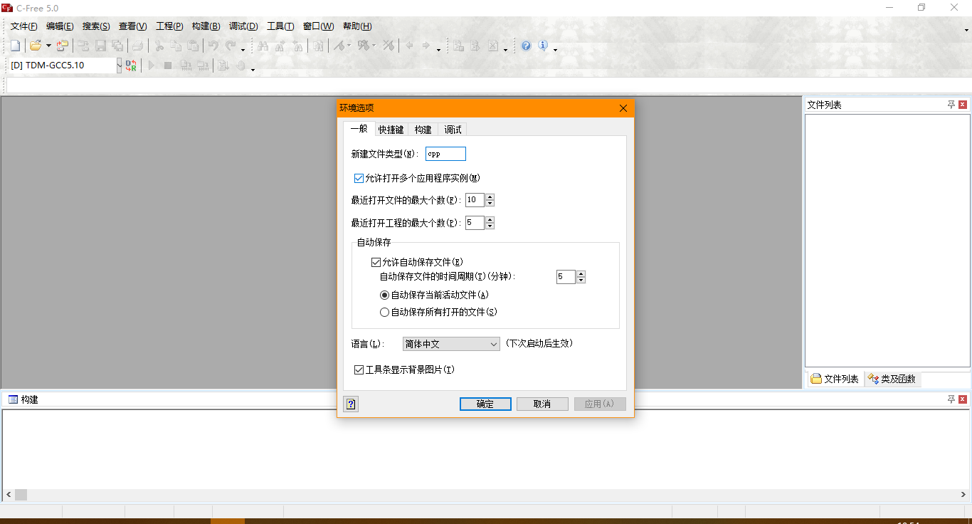 C-Free 安装好后默认为 C++ 开发环境, 我们需要将其修改为 C语言 的环境. 打开 工具-环境选项 将 新建文件类型修改 由 cpp 修改为 c.